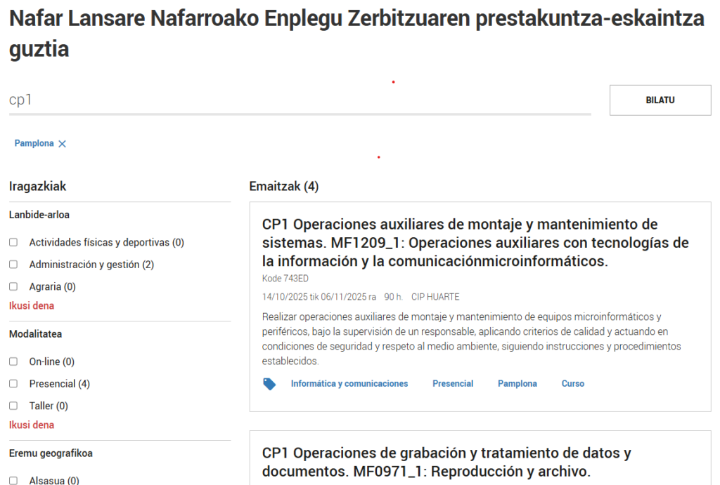 Kodea duzunean, interesatzen zaizun prestakuntza bilatzen ahal izangen duzu Nafarroako Enplegu Zerbitzuaren prestakuntza-eskaintzan sartuta, ikastaroaren leku-iragazkia (Iruñea, Altsasu, Agoitz…) eta interesatzen zaizun CP1a bilatuz: